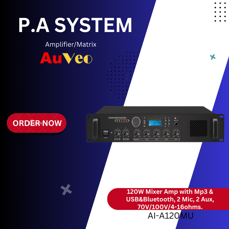 120W Mixer Amp with Mp3 & USB&Bluetooth, 2 Mic, 2 Aux, 70V/100V/4-16ohms.
